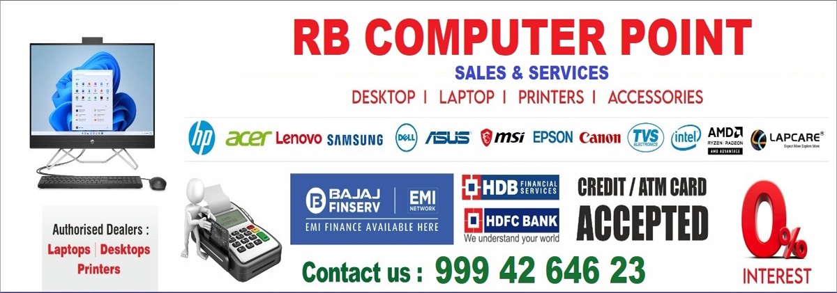 At RB COMPUTER POINT, we specialize in the sales and service of desktops, laptops, printers, and a wide range of computer accessories. As authorized dealers for all leading brands, we bring you the latest in technology — from high-performance machines to budget-friendly options that suit every need and pocket. Whether you're a student, a professional, or a business owner, we offer personalized solutions to match your specific requirements.